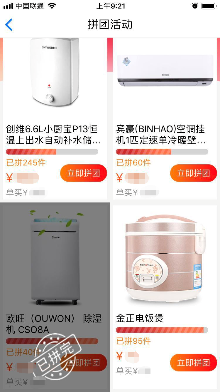 拼团购买享受拼团价,拼团活动为共享活动,所以人均可参与到同一款产品中