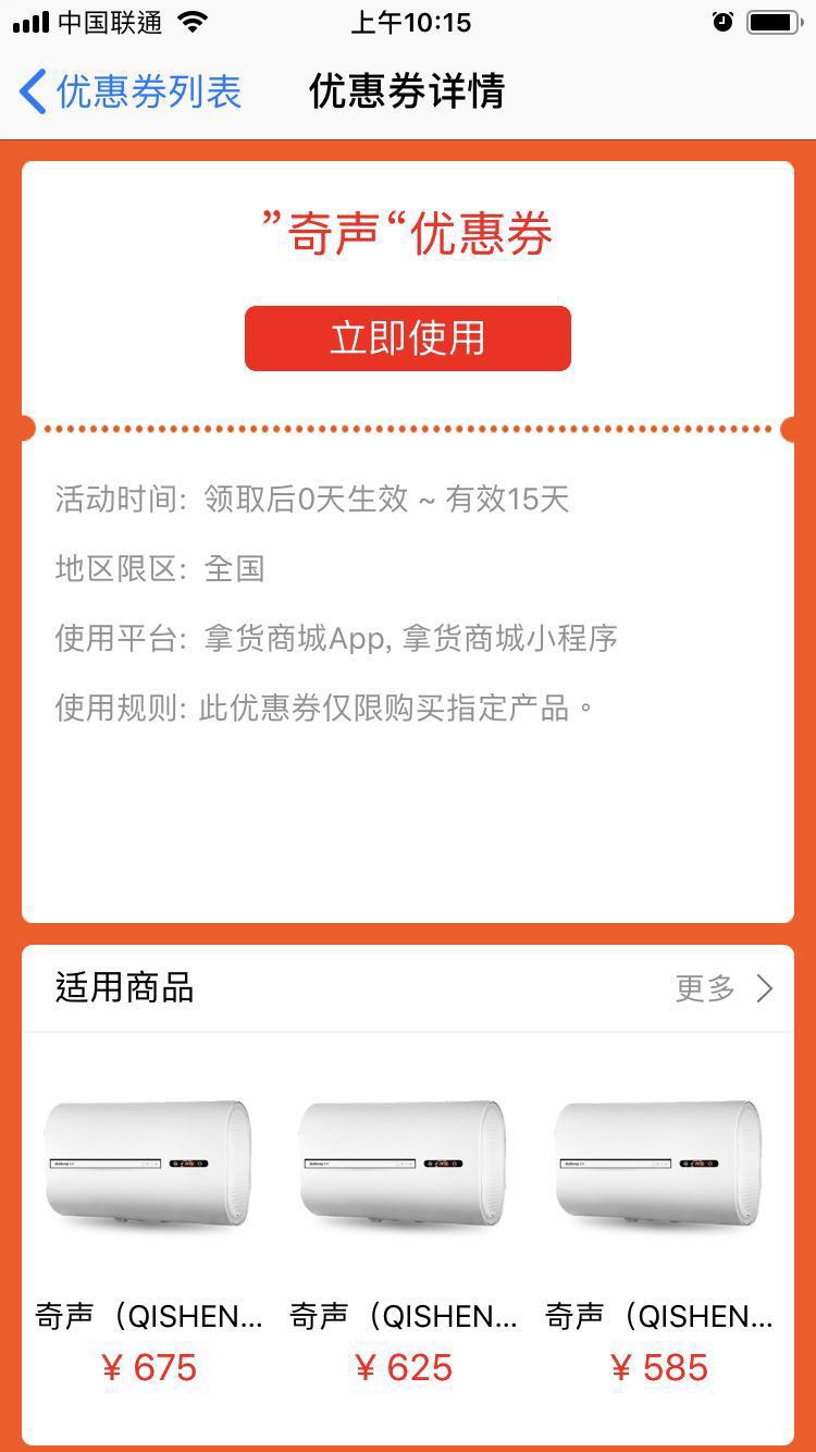 点击想使用的券,阅读使用规则后点击立即使用,择要购买的商品,点击我要拿货选择规格后点击立即拿货,点击使用优惠券即可